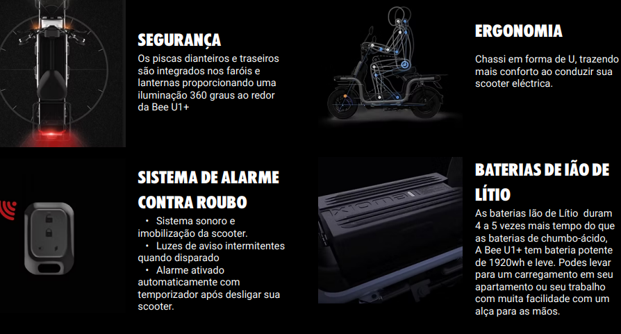 A Bee U1+ é a scooter elétrica urbana ideal para quem procura mais força e desempenho no dia a dia. Com um motor Bosch de alta potência e uma velocidade máxima até 65 km/h, garante deslocações ágeis e confortáveis em ambiente urbano ou estradões ligeiros. A autonomia de até 60 km em modo ECO proporciona viagens económicas e sem emissões, enquanto a bateria de iões de lítio removível facilita o carregamento em casa ou no trabalho. Equipada com pneus maiores, suspensão dupla e travões a disco CBS, oferece segurança e estabilidade, mesmo em terrenos irregulares. O design ergonómico com faróis e lanternas integrados, painel digital completo e sistema de alarme anti-furto tornam a Bee U1+ uma escolha completa para quem quer mobilidade elétrica potente, prática e segura.
